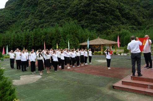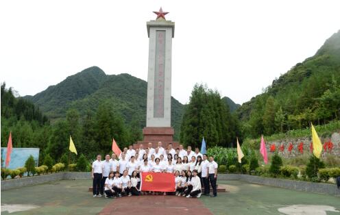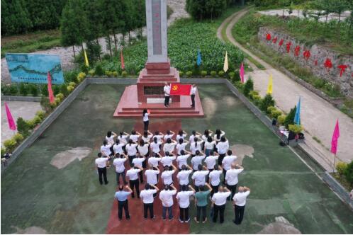 荥经县纪委监委组织全体党员干部在红军长征过泡桐岗纪念碑前与党旗合影,用嘹亮的歌声为中国共产党建党101周年献礼。