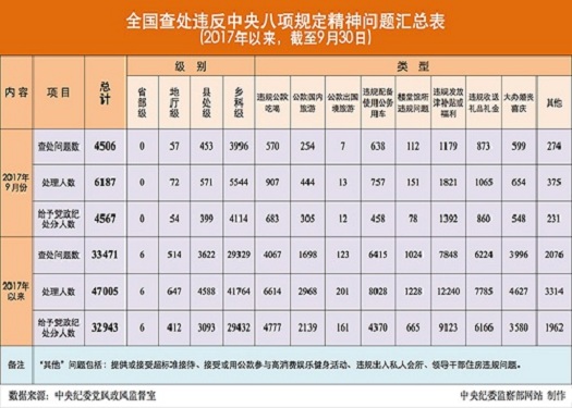 为掌握全国贯彻落实中央八项规定精神情况,中央纪委在31个省区市和新疆生产建设兵团、139个中央和国家机关、98个中央企业、15个中央金融企业建立了落实中央八项规定精神情况月报制度。2017年以来,截至9月30日,全国查处违反中央八项规定精神问题情况如下: